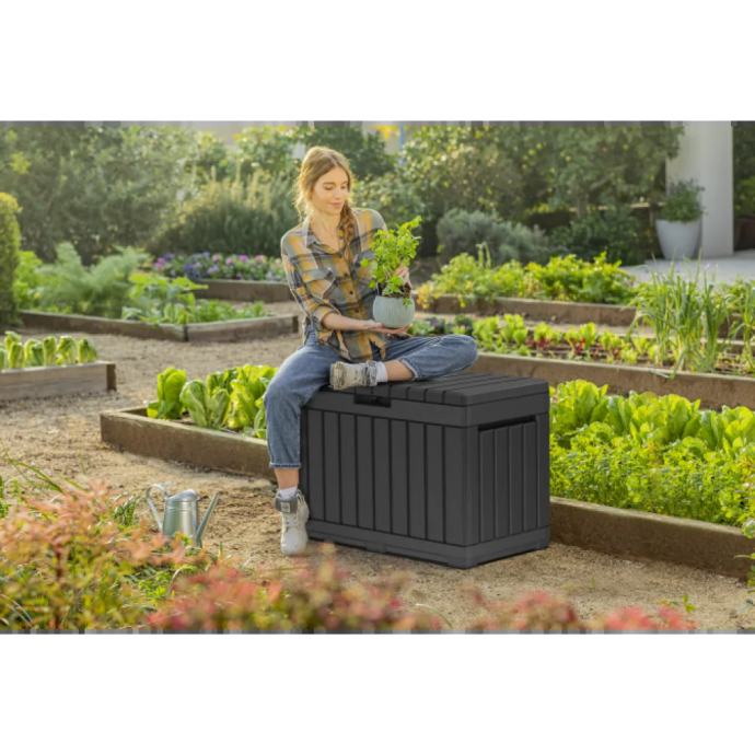 Plastična kutija zapremnine 190L. Kutija za pohranu Kentwood omogućuje vam praktično pohranjivanje svega što želite da vam bude pri ruci u vašem vrtu. Idealno spremište za vrtni alat, kante za zalijevanje, posude za cvijeće, jastuke ili mali vrtni alat i dječje igračke. Njegova montaža je vrlo jednostavna i ne zahtijeva posebne alate.