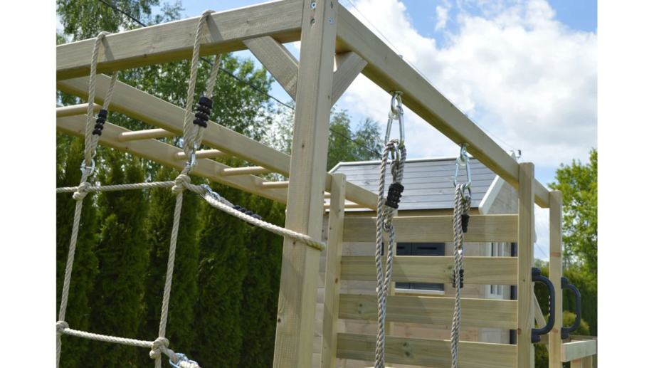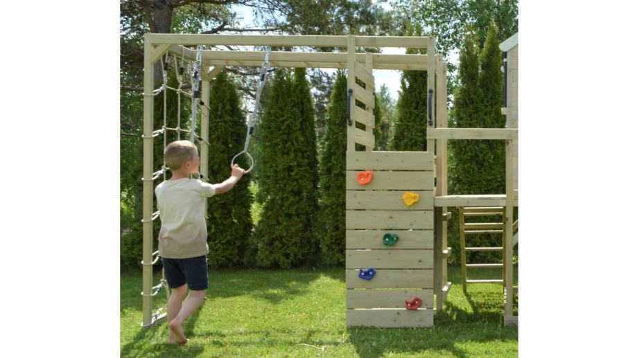 Pripremite se gledati kako vaša djeca istražuju, vježbaju i zabavljaju se na svježem zraku uz dodatak za teretanu. S dovoljno prostora za igru do troje djece, odlično će se zabaviti testirajući svoje granice i izazivajući se uz zid za penjanje, mrežu za penjanje, gimnastičke krugove i šipku za penjanje.