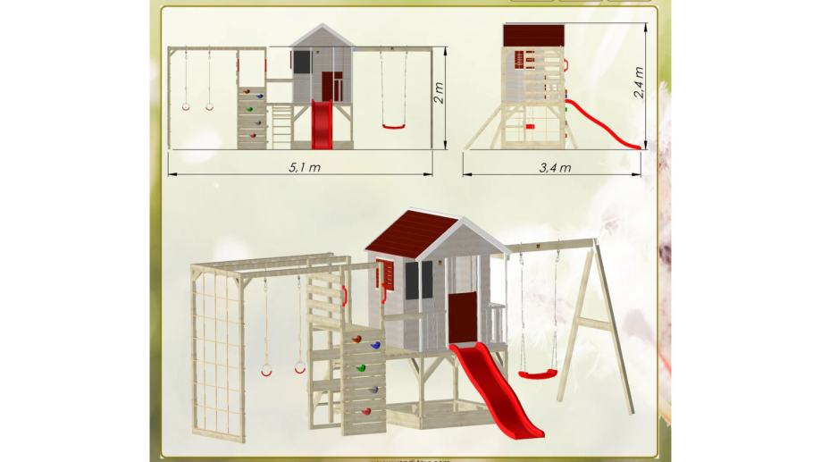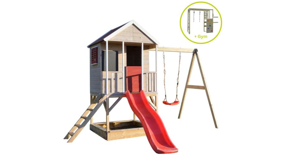 Izgrađena na platformi visokoj 90 cm, ova kućica za igru će vaše mališane držati aktivnima i zaokupljenima satima. S pješčanikom ispod, pločom za crtanje, funkcionalnim prozorom s kapcima, terasom i policom, kućica za avanturu prepuna je značajki koje će igru vašeg djeteta učiniti još uzbudljivijom! A kao da to nije dovoljno, tu je i priloženi plastični tobogan dug 175 cm i ljuljačke visoke 200 cm sa strane. Pravi adrenalin!
