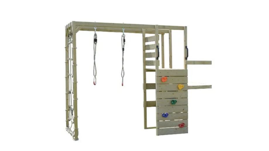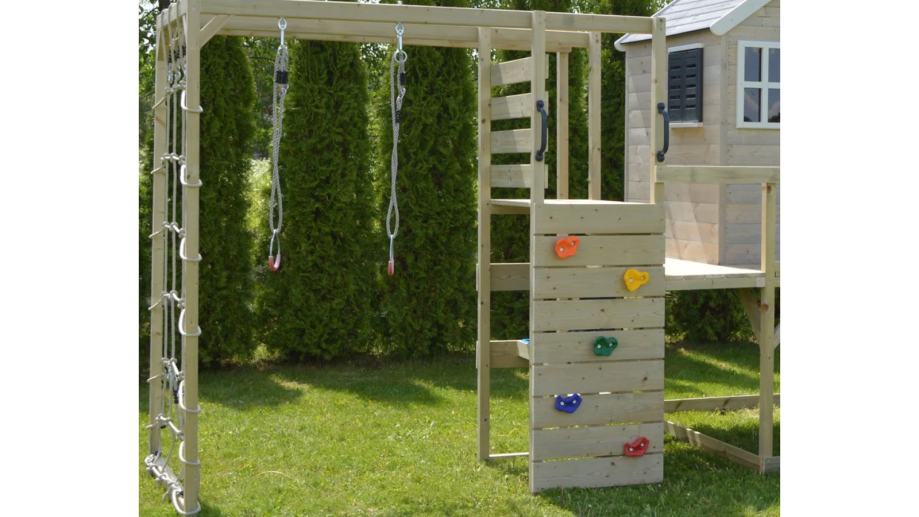 Pripremite se gledati kako vaša djeca istražuju, vježbaju i zabavljaju se na svježem zraku uz dodatak za teretanu. S dovoljno prostora za igru do troje djece, odlično će se zabaviti testirajući svoje granice i izazivajući se uz zid za penjanje, mrežu za penjanje, gimnastičke krugove i šipku za penjanje.