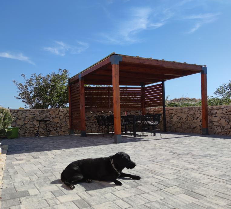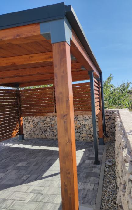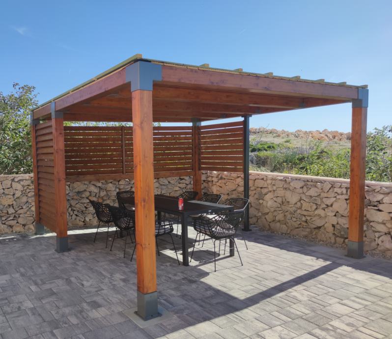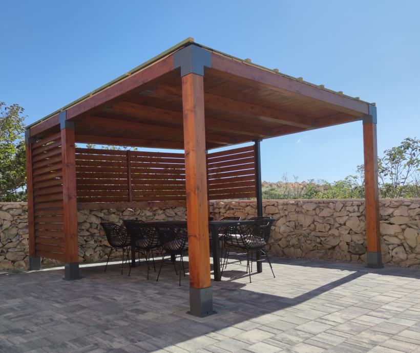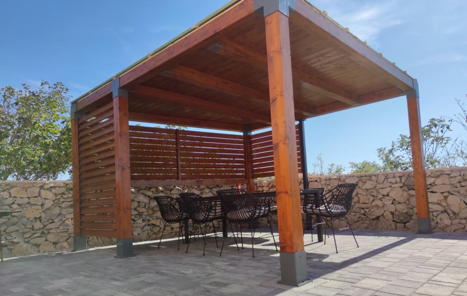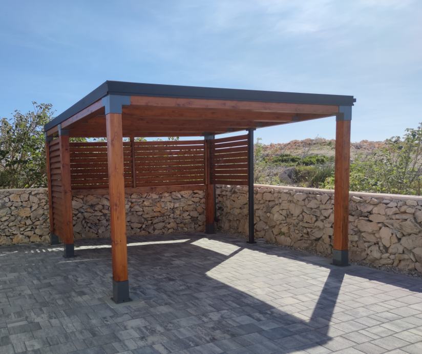Moderna drvena sjenica. Mogućnost izrade kombinacijom drvo/aluminij. Sjenilo može biti od aluminija a sve ostalo drvo, ili stupovi i sjenilo aluminij a ostalo drvo....itd.