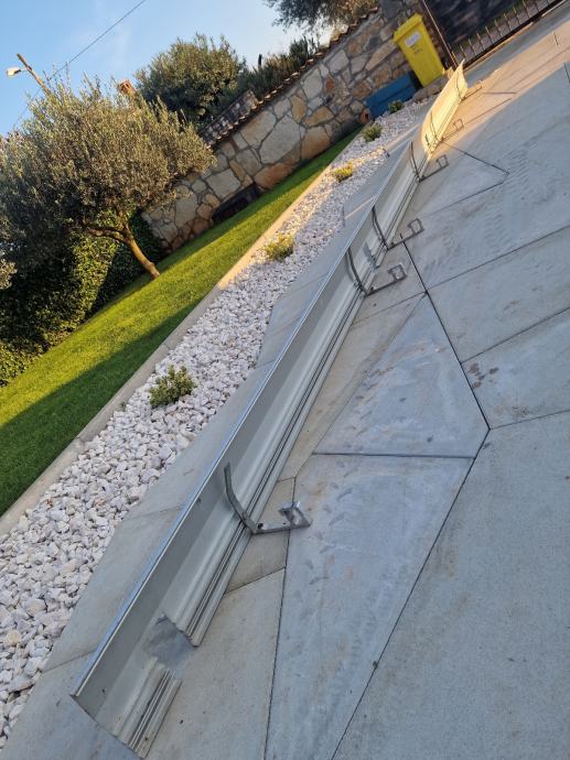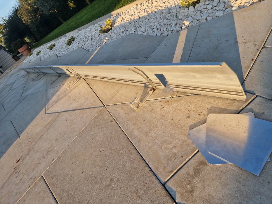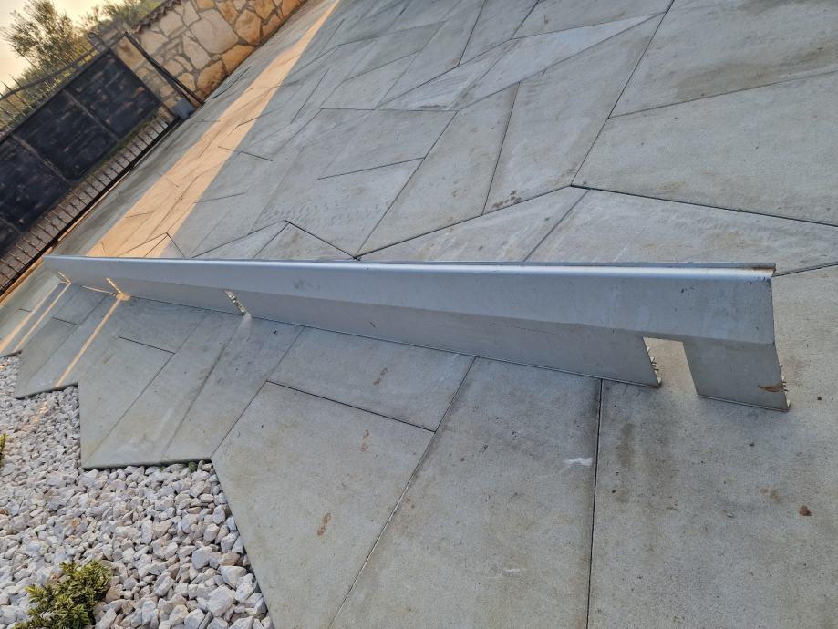 Nadstrešnica za tendu, aluminijska, sa nosačima za fiksaciju na tendu i bočnim stranicama, dimenzije 656x32cm, za 60 eura prodajem.