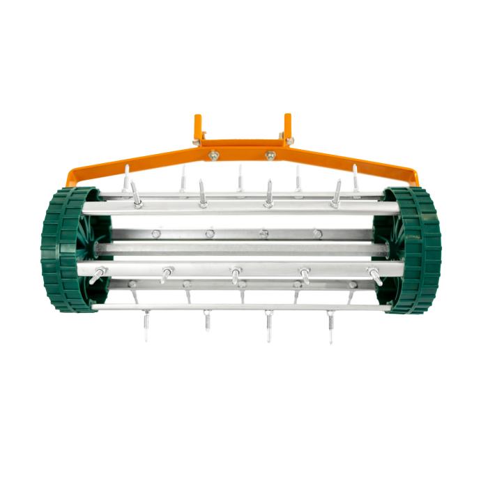 Ručni aerator za travnjak stručno je izrađen za poboljšanje aeracije tla, potičući zdraviju i jaču travu omogućujući esencijalnim hranjivim tvarima, vodi i kisiku da dopru do korijena. S velikodušnom širinom od 42 cm i visinom od 25 cm, pokriva znatno područje, čineći aeraciju brzom i učinkovitom. Veliki, čvrsti kotači osiguravaju glatko kotrljanje po vašem travnjaku, čak i na neravnom terenu, dok lagani dizajn poboljšava upravljivost.