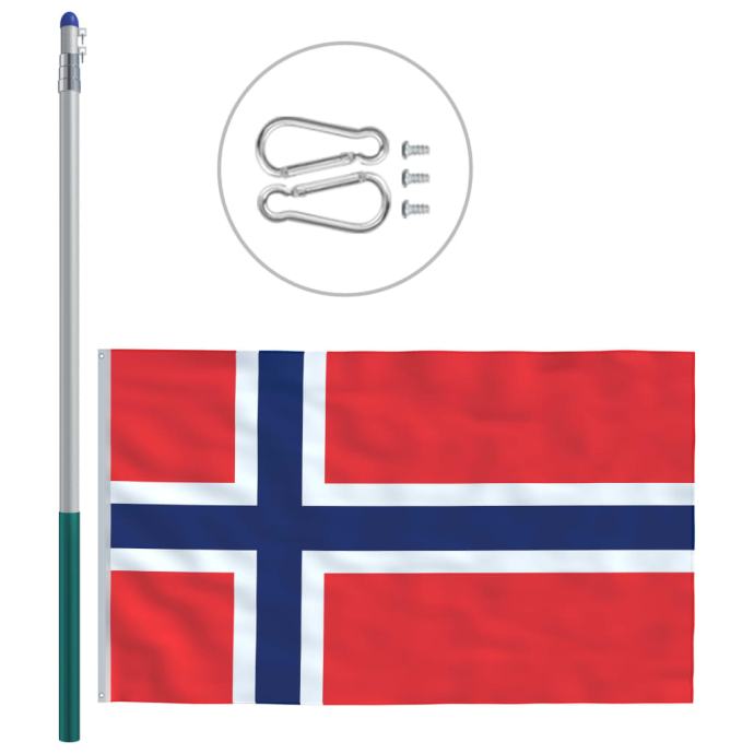 Norveška zastava napravljena je od izdržljivog poliestera i opremljena dvjema čvrstim mjedenim kopčama kako bi se osigurala dugotrajna upotreba. Uz to, zastava ima ojačane rubove i dvostruke šavove kako bi se spriječilo kidanje. Zahvaljujući jednostavnom sustavu spajanja, stup za zastavu može se začas postaviti, a visina se može mijenjati zahvaljujući njegovom teleskopskom dizajnu. Izdržljivi umetak za tlo omogućuje da se stup zabode u zemlju i ostane na mjestu. Uz uključeno uže i prstene, možete dizati i spuštati svoju zastavu bez problema.