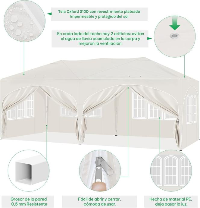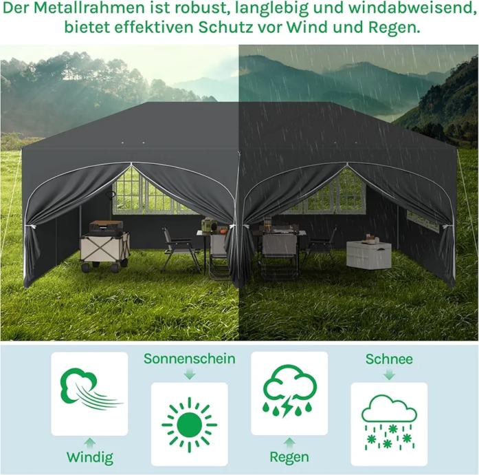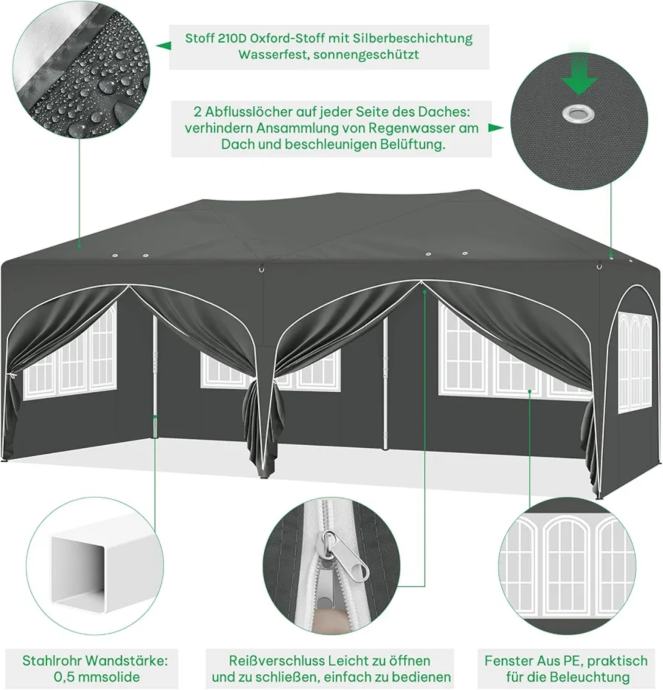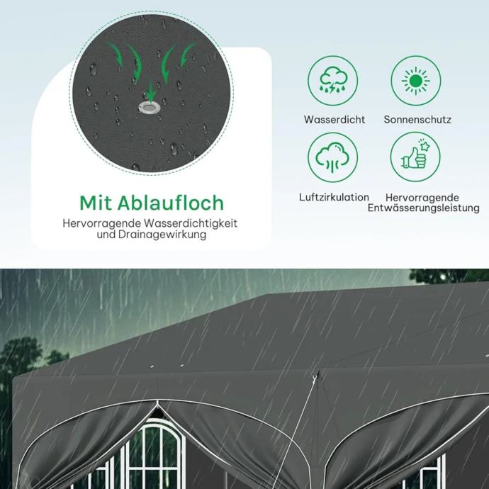 210D Oxford tkanina + vodootporni dizajn, zaštita tijekom cijele godine: Oxford tkanina sa srebrnim premazom i ojačanim šavovima otporna je na kišu i blokira ultraljubičaste zrake (UV zaštita). Na krovu se nalaze drenažni otvori sa svake strane za odvod vode i snijega. Metalni okvir otporan je na hrđu i izdržljiv je za sunčane i kišne dane.