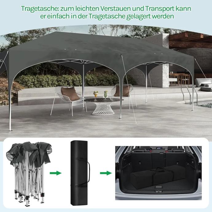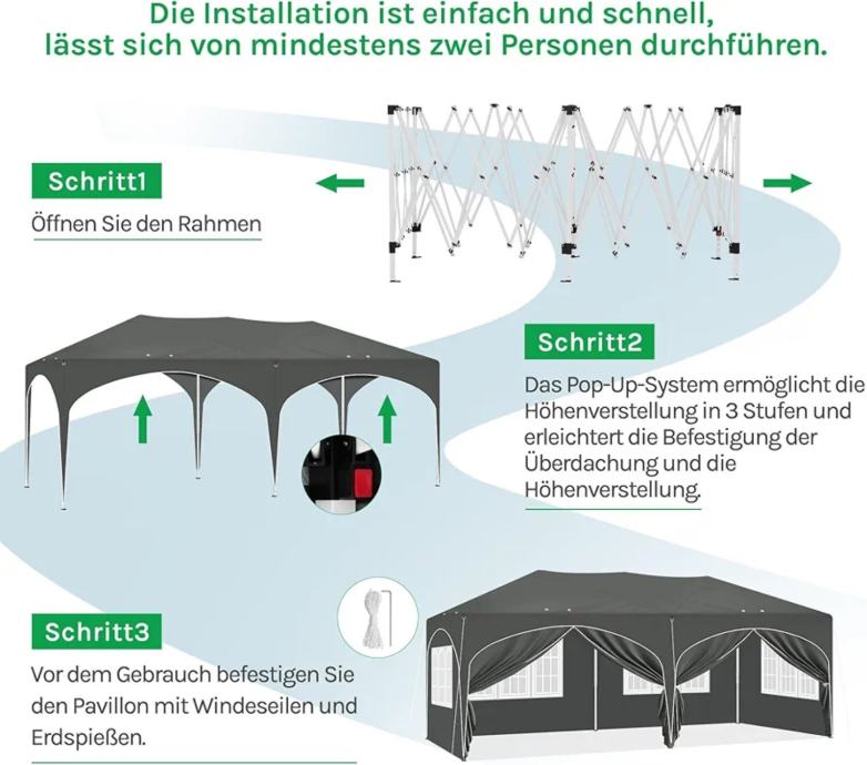 JEDNOSTAVNA SASTAVLJANJA ZA TRENUTNU UPOTREBU: Zahvaljujući inovativnoj sklopivoj strukturi, nije potreban alat, a pergola se može sastaviti za 3 minute. Visina se može podesiti u 3 razine (250-258 cm) kako bi se prilagodila različitim scenarijima. Nema komplikacija sastavljanja!