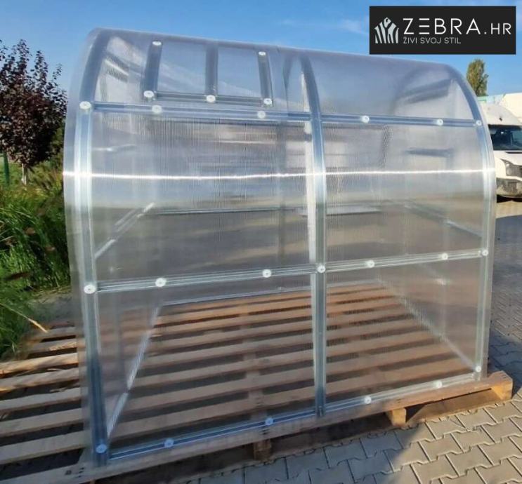 Zidovi su prekriveni kvalitetnim celularnim polikarbonatom (EU proizvodnja) s UV stabilizatorima. Prozirnost od cca 85% osigurava dovoljno svjetla, dok struktura ploča čuva toplinu i štiti od tuče. Montaža se vrši M5 vijcima i D40mm podloškama za maksimalnu sigurnost.