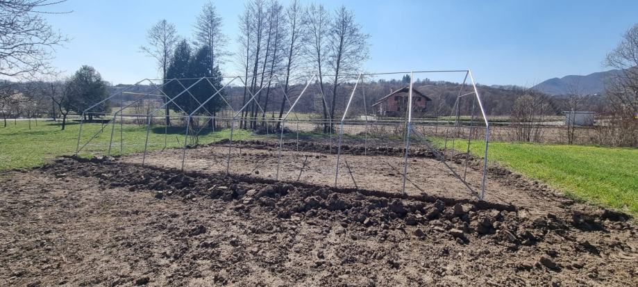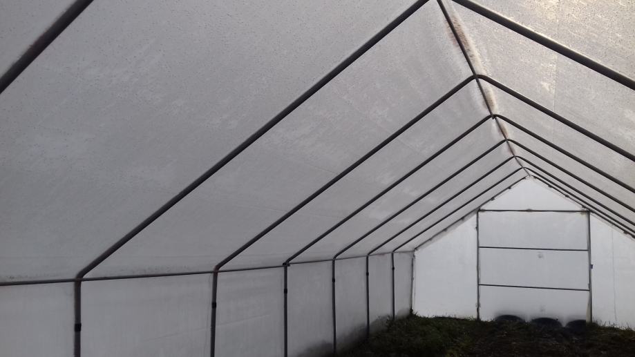Plastenik nikad montiran isti kao i na slici,čvrste čelične pocinčane cijevi promijera 34mm .Sirina 4.5m i duzina 6m.(MOZE I DUZI)Središnja visina 2.7 m. NOVI SISTEM izvedbe plastenika ''KROV'' pogodniji za područja di može biti zimi puno snjega.Zbog načina izvedbe SISTEM KROV puno jači nego polukruzno piganje.××××××× . Moze i duza duzina do 20m. 091 6294 032