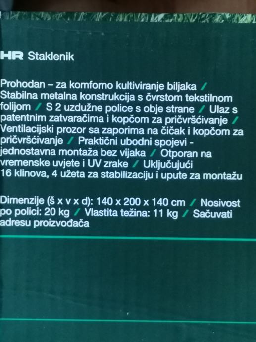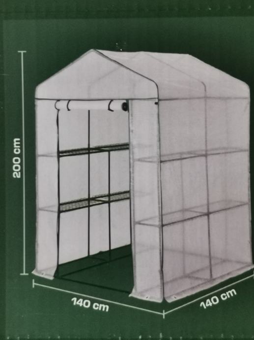Prodajem novi, zapakirani plastenik, garancija 3 godine.. kupljen jučer 22.03.2025. DxVxŠ 140x200x140.. metalna konstrukcija, sa svake strane po 2 police nosivosti svake po 20 kg.. za ostale informacije nazovite 098/990 1494