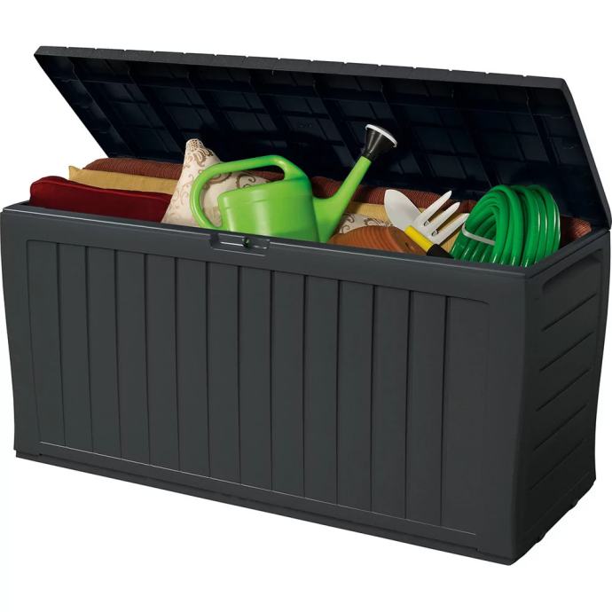 Plastična kutija za odlaganje raznih predmeta (jastuci, vrtni alati ...) tvrtke KETER. Prednost ove kutije je jednostavna instalacija (bez upotrebe alata - sve možete sastaviti u kompletu), visokokvalitetna kutija i moderan dizajn. Materijal ima UV zaštitu i otporan je na nepovoljne vremenske uvjete. Može primiti do dvije osobe, pa se proizvod može koristiti i kao klupa.