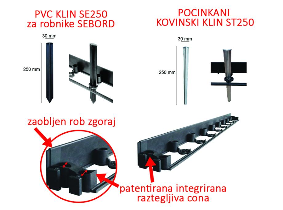 Gornji zakrivljeni oblik osigurava stabilnost otvora za pričvršćivanje svih SEBORD i SLIBORD rubnjaka, konusni oblik olakšava zabijanje u zemlju.