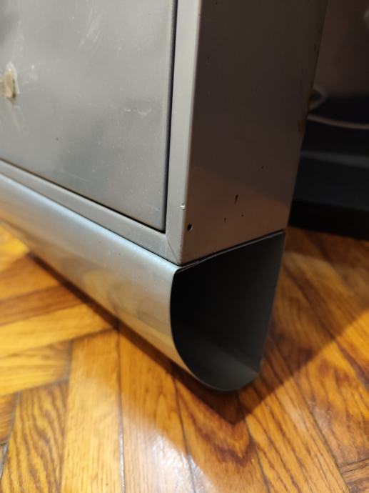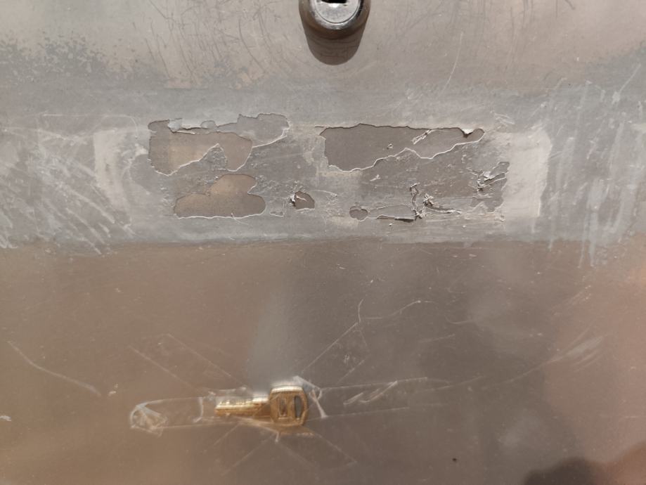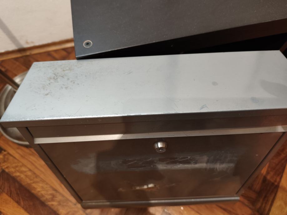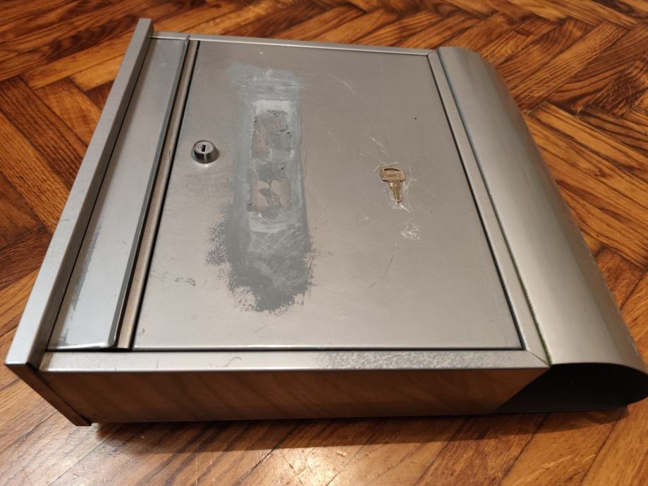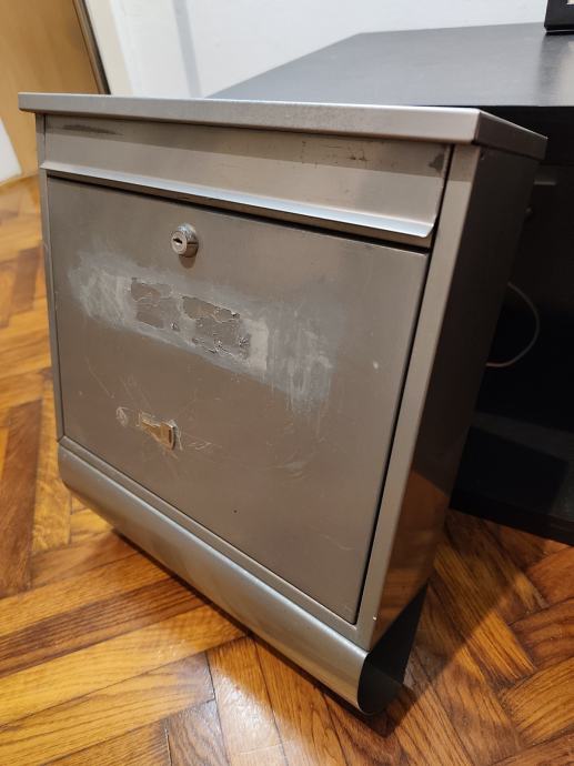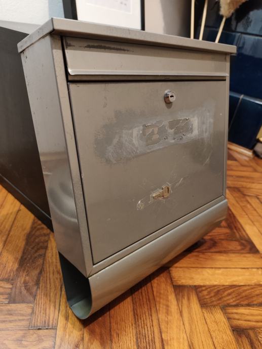 Rabljeni sandučić 43x36,5x11,5 sa ključem i prostorom za novine, lak je oštećen na mjestu gdje je bila zalijepljena pločica s imenom i vidi se da je bio izložen vremenskim prilikama.
