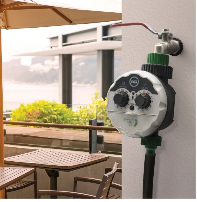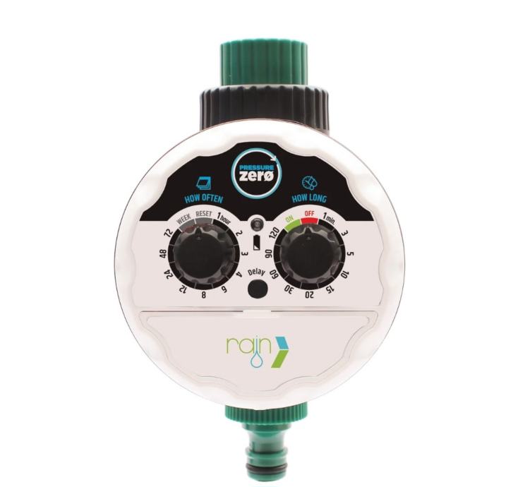 Kuglasti ventil unutar upravljača s montažom na slavinu ii spremnik *Zero Pressure* omogućuje protok vode izravno kroz njega bez pada tlaka. Upravljač se može instalirati na sustave s kap po kap navodnjavanjem, što ga čini idealnim za kućne vrtove ili terase. Dva programatorska gumba omogućuju podešavanje učestalosti i trajanja zalijevanja, dok tipka za odgodu omogućuje odgodu prvog pokretanja do najviše dva sata. Prvo zalijevanje uvijek se događa na kraju postavljene učestalosti; na primjer, ako je postavljena učestalost 12 sati, prvo zalijevanje će započeti nakon 12 sati od trenutka programiranja. Ako se tipka za odgodu pritisne jednom ili dvaput, zalijevanje će umjesto toga započeti nakon 13 odnosno 14 h.