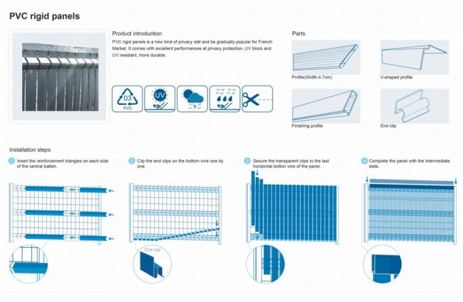 *Montaža je vrlo brza i jednostavna - PVC ploče, potporne šine i obujmice se odozgo uvlače u metalnu mrežu.