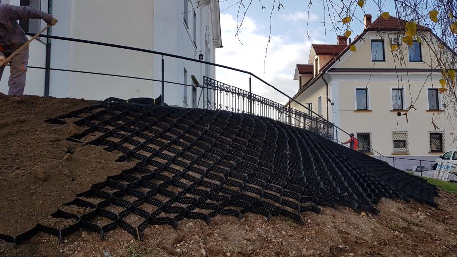 Na početku instalacije na vrhu i između na više mesta preporučljivo je pričvrstiti s klinovima od željeza duljine više od jednog metra. Za spajanje rešetka jedna sa drugom upotrebite plastične vezice. Rešetke možetepuniti sa: zemljom, šljunkom, pijeskom, korom, betonom ili drugim punilima. Perforirane stijene rešetke dopuštaju da voda ne ostane u komori, da teče od komore do komore do dna. Veličine komore omogućuju da odmah posadite drveće ili grmlje.