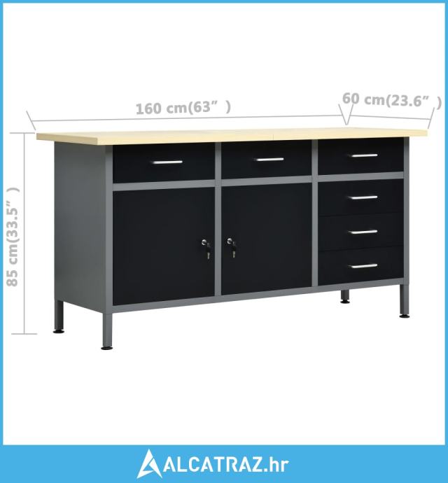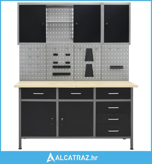 Izdržljivi radni stol ističe se velikim prostorom za pohranu i nosivošću od 500 kg. Velika i čvrsta stolna ploča pruža stabilnu platformu za sve popravke. Radni stol ima 6 ladica za odgovarajuće organiziranje vašeg alata, dijelova i pribora poput vijaka, čavala i ljepljive trake. Sve ladice opremljene su mehanizmom s kugličnim ležajem za glatko klizanje. Tu su 2 police i veliki odjeljak s 2 vratima koja se mogu zaključati, za jednostavno smještanje bušilica, bubnjeva s kabelom i brusilica. Uz to, noge se mogu podesiti po visini. Ova radna stanica izrađena je od vrhunskog čelika i iverice, što je čini izuzetno čvrstom, izdržljivom i jednostavnom za čišćenje. Lako se sastavlja.