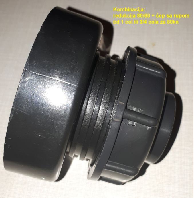 Redukcija za 1000l IBC spremnik sa izlazom od 80mm reducira na 60mm gdje se može montirati čep sa redukcijom od 1 col ili 3/4 cola