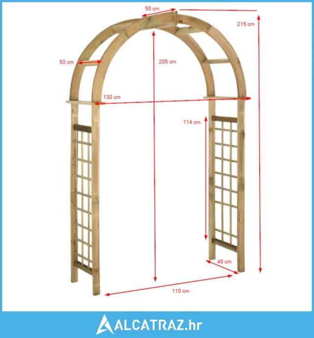 - Masivna borovina: Ovaj čvrsti luk za ruže izrađen je od zeleno impregnirane borovine, što ga čini izdržljivim i otpornim na truljenje.