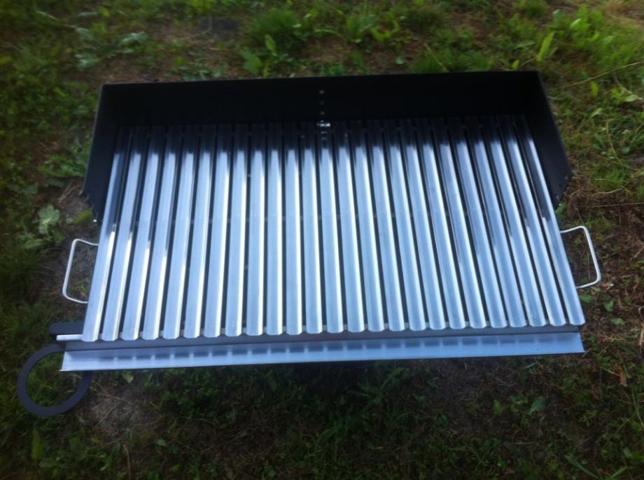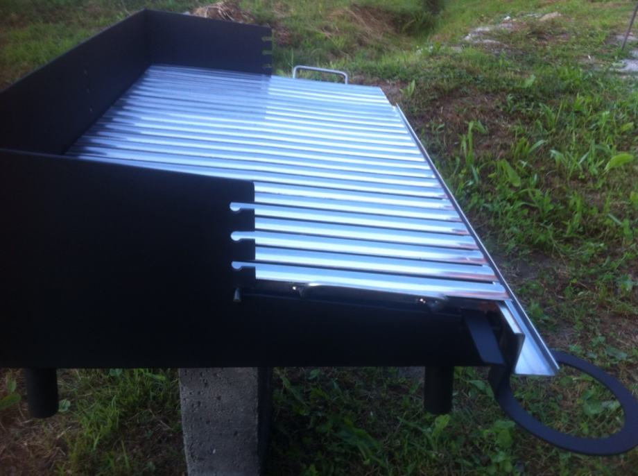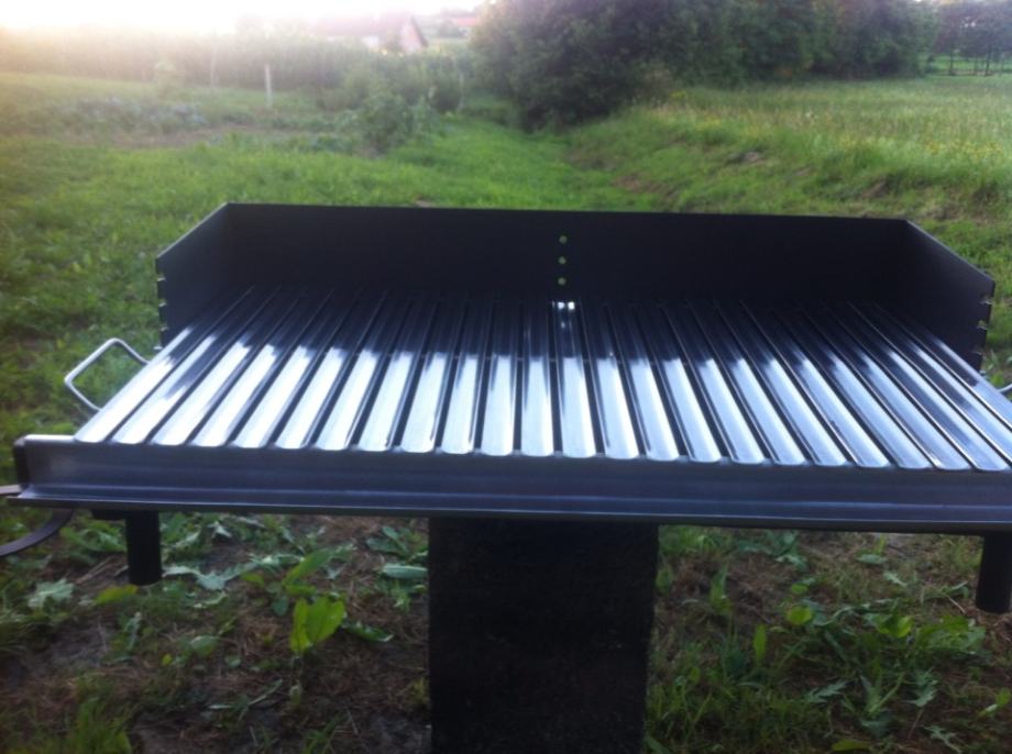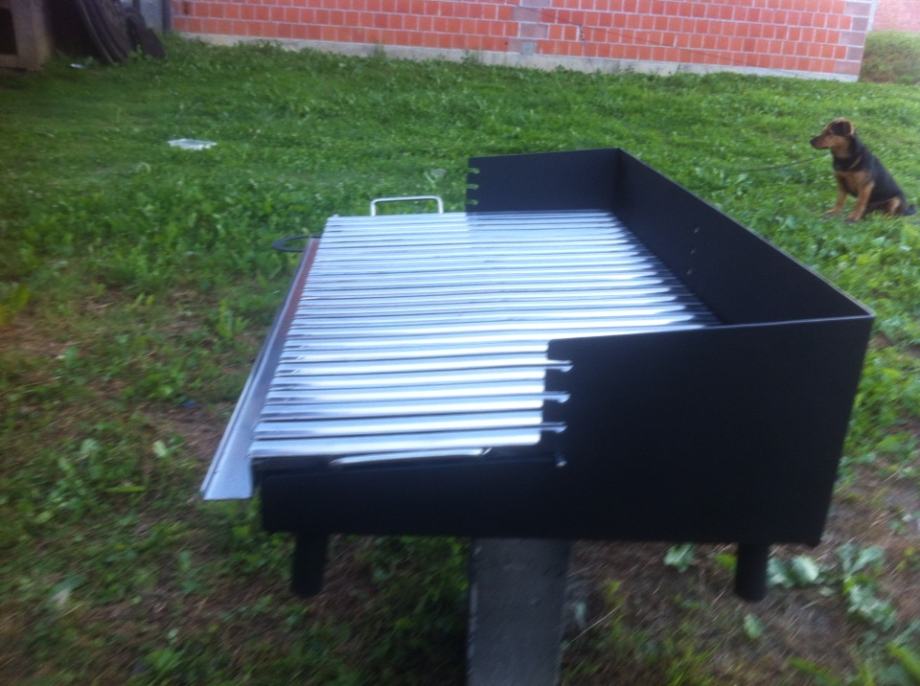 Masivni rostilj dimenzija 800x450,letvice od inox lima debljine 2mm,postolje(kutija)od lima debljine 3mm.Ploca roštilja je podesiva ima 4visine(položaja).Cijeli je rostilj napravljen u laganom padu tako da se sva masnoća slijeva u čašicu sa strane,kutija je dodatno pojačana da se spriječe eventualna piganj(savijanja)kod visokih temperatura.Kutija je obojano specijalnom vatrostalnom bojom.Moguca izrada roštilja po želji kupca.Zvati poslje 19 h.