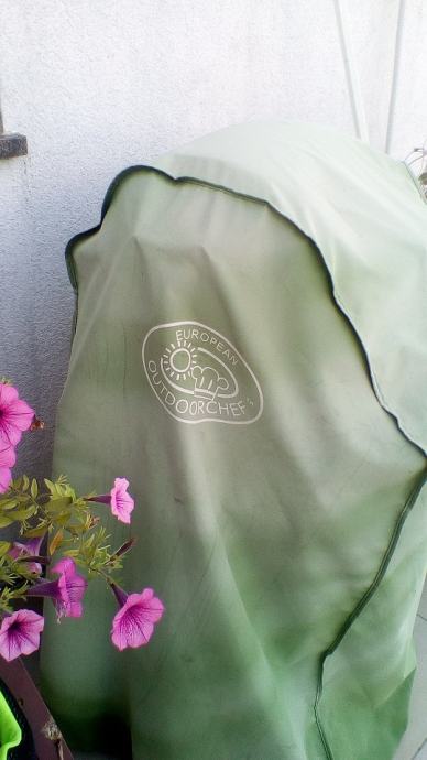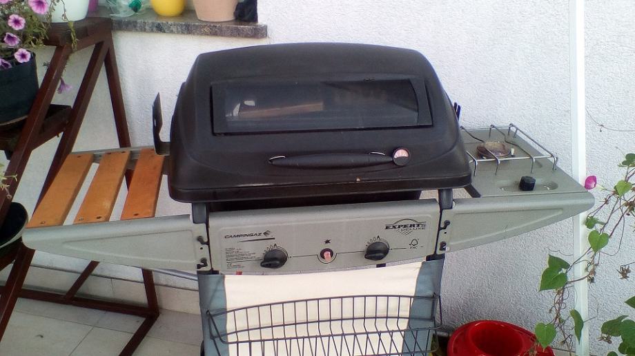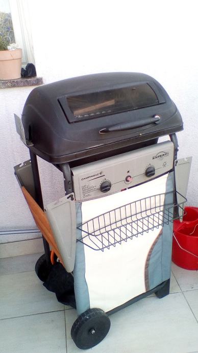 Roštilj campinggas s lava kamenom i ražnjem za piliće na baterije.Ima plinsko kuhalo i zaštitnu ceradu.