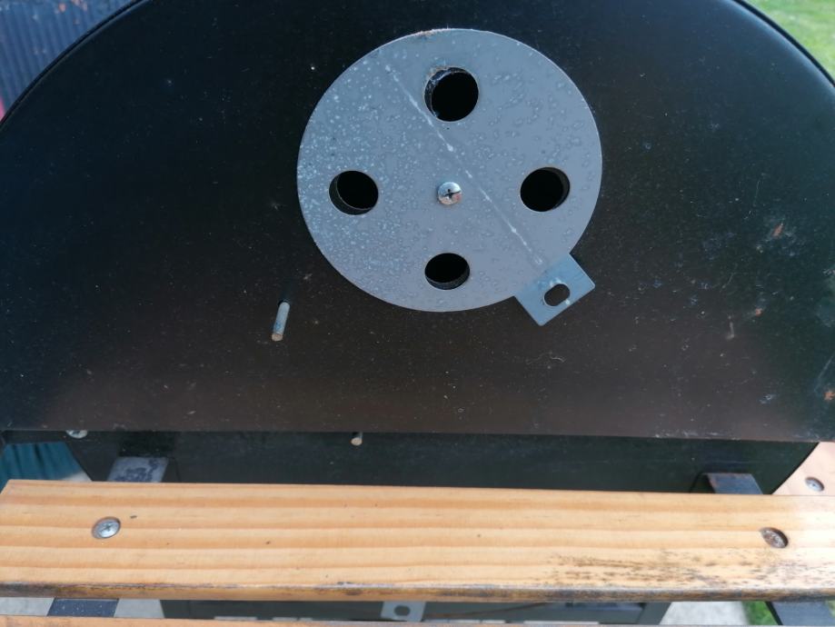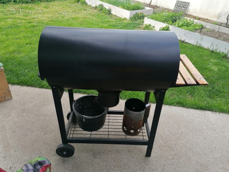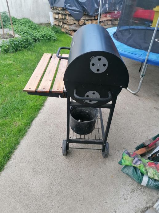 Roštilj na ugljen slabo korišten na točkice, ima otvore za zrak, odlično peče i kada se spusti, daščice su prelakirane, dimenzije su 120x100x40 plus posuda za paljenje ugljena
