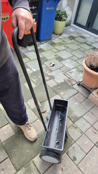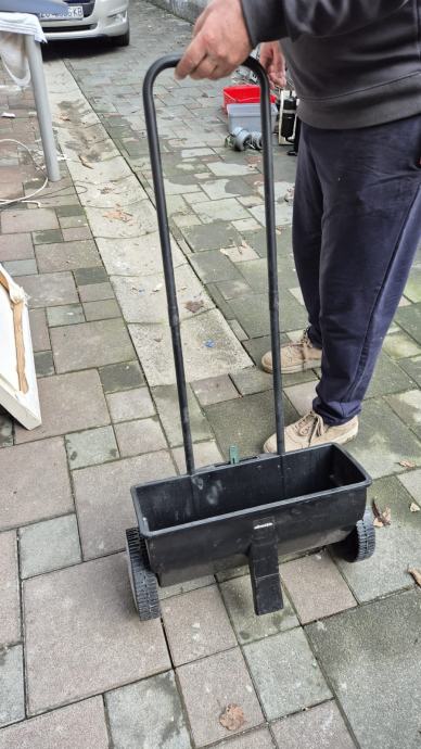 Prodajem ručnu sijačicu na kotačima, crne boje. Radi se o modelu s većim plastičnim spremnikom i metalnom ručkom, pogodnom za sjetvu sjemena ili rasipanje gnojiva po vrtu. Kotači s narebrenjem omogućuju stabilno kretanje po raznim podlogama. Dimenzije spremnika su prikladne za pokrivanje većih površina u jednom prolazu.