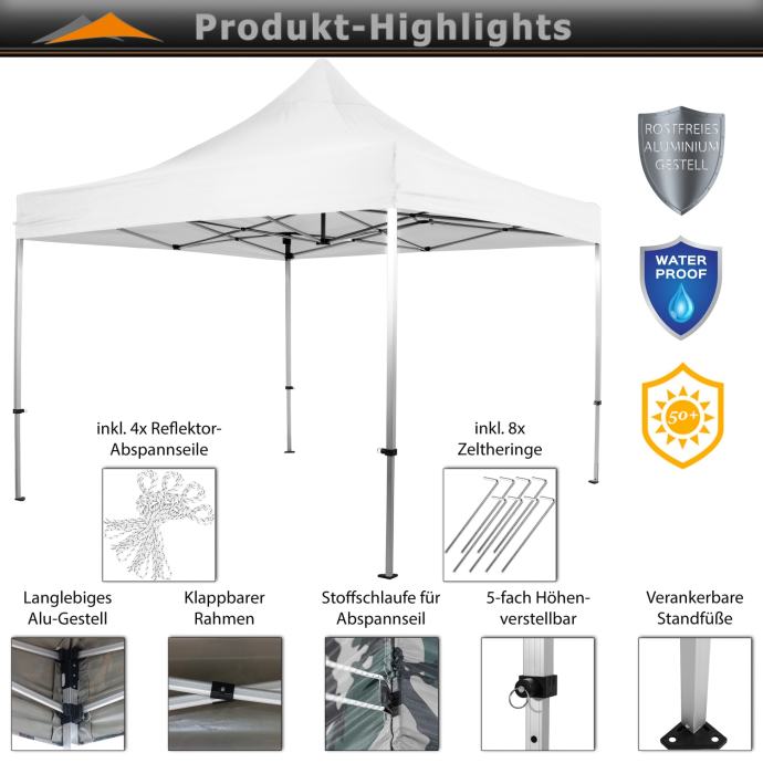 MAKSIMALNA STABILNOST I FUNKCIONALNOST: Ekstra jake teleskopske noge (30 x 30 mm), robusni okvir u obliku škara (23 x 12 mm), povećane noge, ekstra stabilni zglobni spojevi, 5-struko podešavanje visine od 310 - 340 cm (prostor za glavu 177 - 207 cm ), visokokvalitetni klik sustav s zaključavanjem vanjskim zasunom s prstenom za povlačenje, integriranim središnjim zateznim stupom kao potporom krova za dodatnu stabilnost i visinu