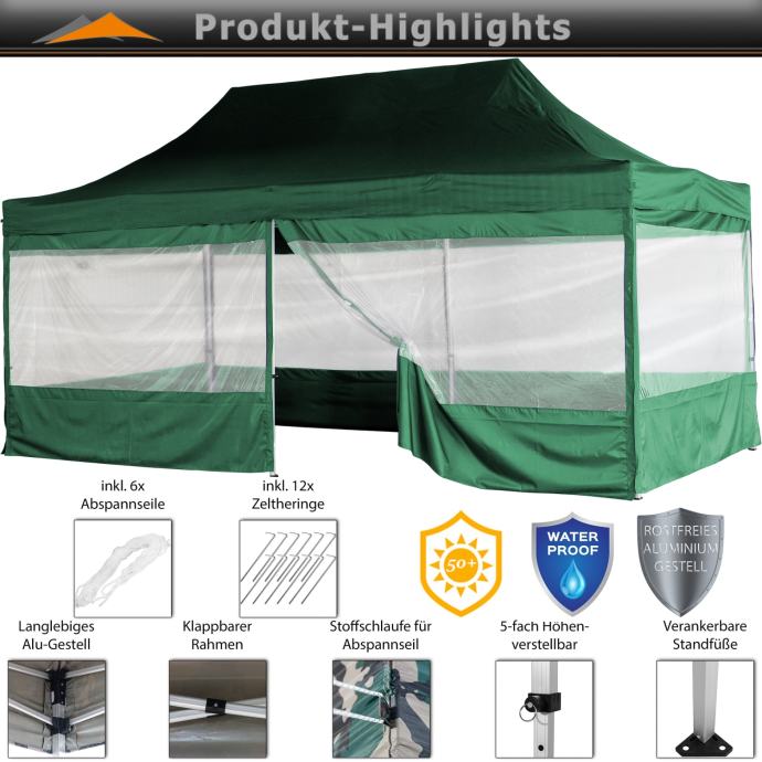 Sklopivi paviljon Instent "Pro" 3 x 6 m s teleskopskim nogama podesivim po visini ima krov od cca 300 g/m² 300D poliestera s dodatnim PVC premazom. Posebno impregnirana krovna tkanina blokira 98% sunčevih UV zraka (UV 50+).Šavovi Pavilona su zabrtvljeni, u tu svrhu je vodootporna filmska traka toplinski zavarena na krovnu tkaninu. Naša sklopiva vrtna sjenica ima visokokvalitetni EV1 aluminijski okvir s dodatnom srebrnom anodizacijom.