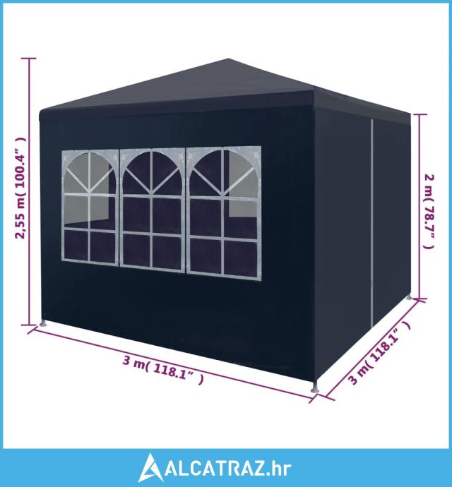 Vrtni šator izrađen je od polietilenskog materijala otpornog na UV zračenje i vodu, stoga je vrlo praktičan za vanjsku uporabu. Okvir je izrađen od čelika otpornog na hrđu, što čini vanjsku nadstrešnicu stabilnom i izdržljivom. Šator za zabave ima bočne panele, od kojih svaki sadrži ukrasne prozore te 1 panel s vratima s patentnim zatvaračem za lakši ulaz. Vrtna sjenica lako se sastavlja.