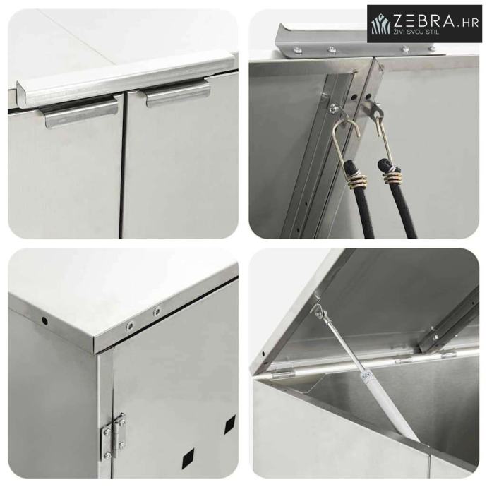 Vodootporni materijal: Ova skladišta su napravljena da izdrže kišu i sunce, zadržavajući sadržaj suhim i zaštićenim. Izdržljiv materijal također je otporan na UV zrake, što znači da će boje ostati kao nove kroz godine. Inovativni proširivi dizajn: Proširiva konstrukcija omogućava prilagodbu različitim potrebama, pa možete dodati dodatne sekcije ako vam treba više prostora. Ovaj pametan dizajn pruža vrhunsku fleksibilnost za korisnika. Prozračna značajka za učinkovitost: Ventilirani dizajn omogućava cirkulaciju zraka, tako da nema neugodnih mirisa. Cirkulacija zraka osigurava da kante ostanu svježe i čiste. Stil modernog dizajna: Ovaj komad se odlikuje jednostavnim, modernim linijama, savršenim za svaki suvremeni prostor. Minimalistički stil osigurava da se savršeno uklapa u svaki vrt ili terasu. Jednostavna njega i održavanje: Održavanje je ludo jednostavno; samo obrišite vlažnom krpom i to je to. Ovo olakšava život svima koji cijene funkcionalnost i ljepotu. Boja: Srebrno