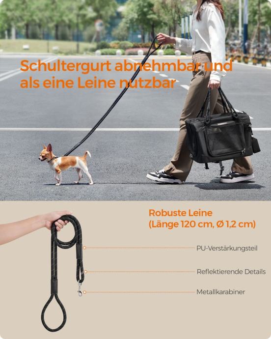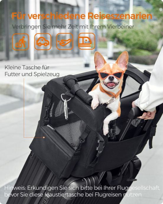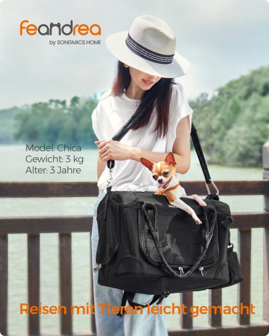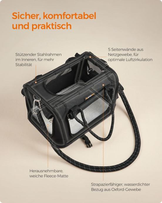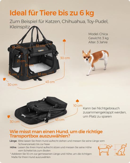 Ova nosiljka za kućne ljubimce dimenzija 43 x 30 x 30 cm idealna je za kućne ljubimce do 6 kg. Preporučene vrste životinja: mačke, čivave, pudle, pomeranci itd. Čelični okvir, vodootporna Oxford tkanina, prozračna mreža i podloga od flisa čine torbu za pse sigurnim i udobnim mjestom za vašeg ljubimca. Otirač se također može ukloniti radi lakšeg čišćenja. Ovaj sklopivi sanduk za pse ima ručke i naramenicu za lakši transport. Lako ga presavijte na 43 x 30 x 10 cm i po potrebi ga spremite u kolica ili u kut. Naramenica 120 x 1,2 cm (D x Ø) izrađena od užeta za penjanje s robusnim karabinerima služi kao povodac kada se skine. Reflektirajući detalji pružaju dodatnu sigurnost tijekom noćnih šetnji. Bez obzira koristite li ga u autosjedalici, putujete vlakom ili ga pričvrstite na svoj kofer za dodatnu praktičnost, ova nosiljka za pse pokriva vas! Međutim, ako putujete zrakoplovom, provjerite kod zrakoplovne tvrtke. Za sve informacije nazovite na broj telefona 092/399-75-19