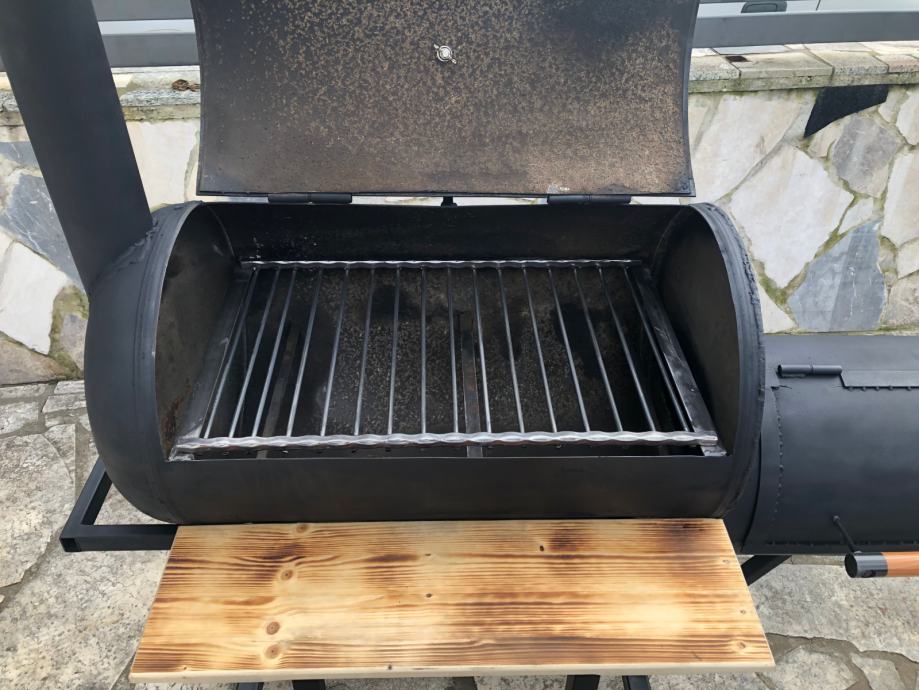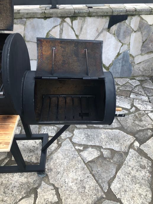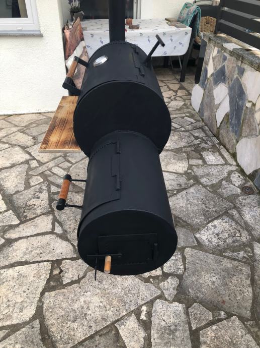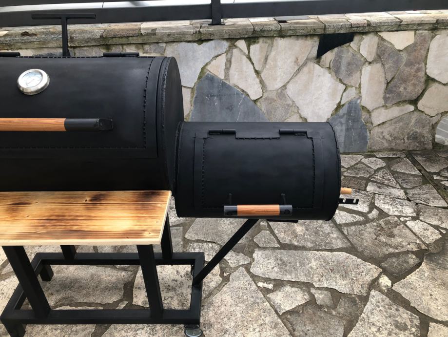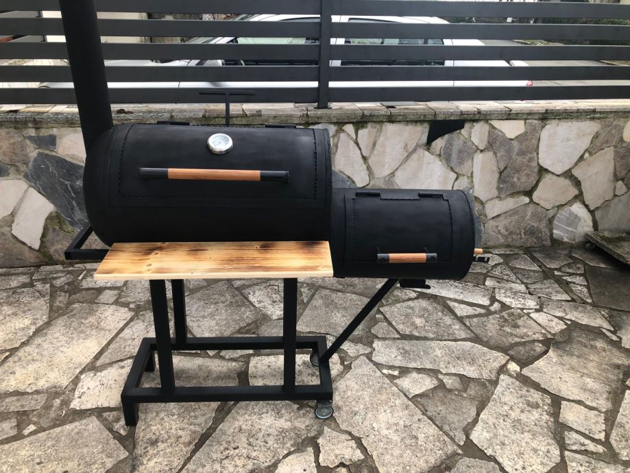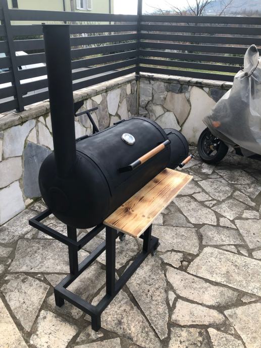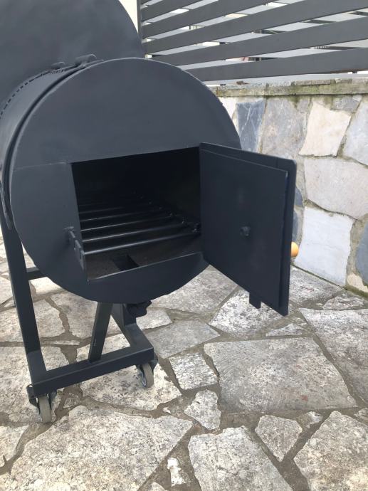 Smoker na ugljen, drva. Izrađen od kvalitetnog materijala. Profili 40x40, 100l velicina bacve za pecenje mesa, 30l loziste.