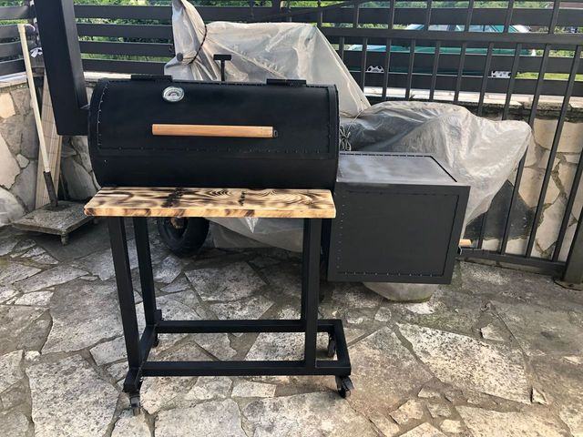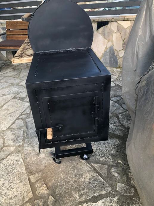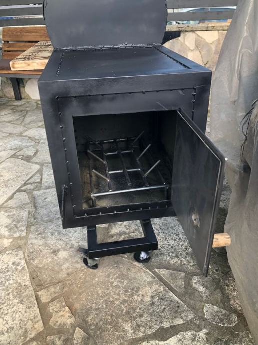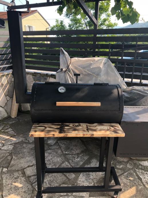 Prodajem Smoker, napravljen od kvalitetnog materijala. Dimenzije: visina 170cm s dimljakom, duzina 150cm, sirina lozista 40x35cm.