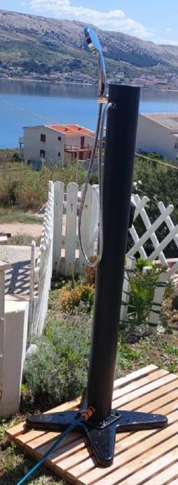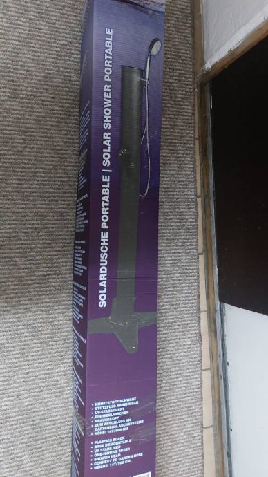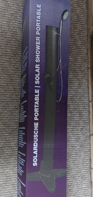 Solarni tuš ima spremnik i okretni ventil za vodu.