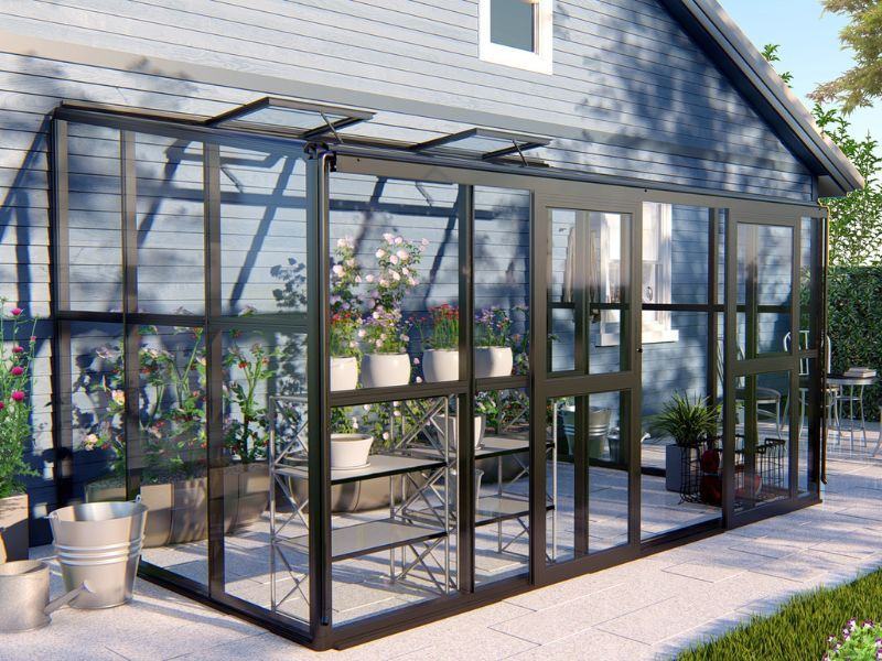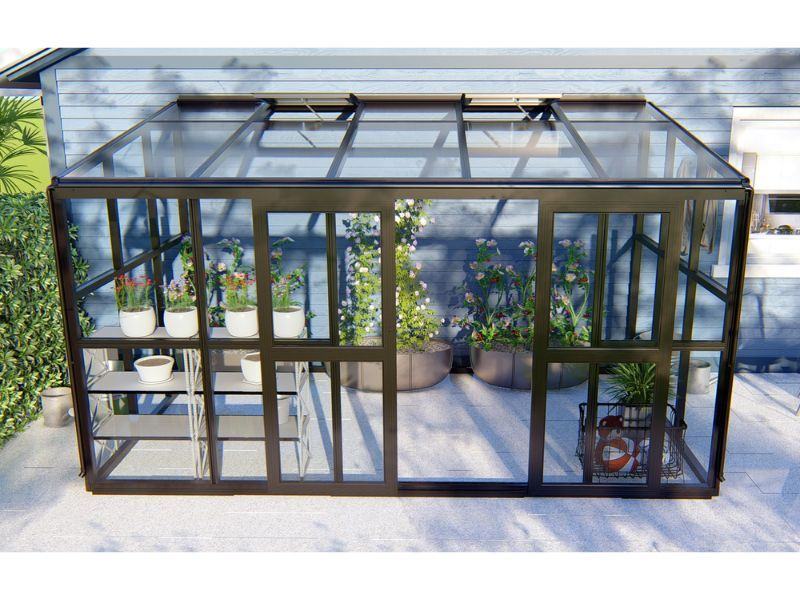Ovaj staklenik nudi dovoljno prostora kako za uzgoj biljaka tako i za opuštanje u prirodi. Dvostruka klizna vrata su robusna i mogu se zaključati radi sigurnosti, dok dva krovna ventilacijska otvora osiguravaju optimalan protok zraka i ventilaciju.