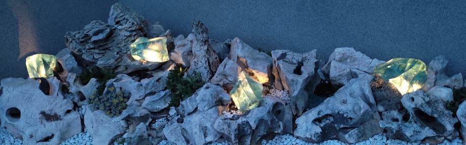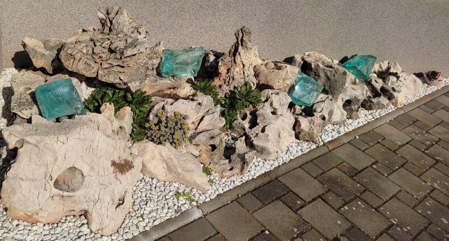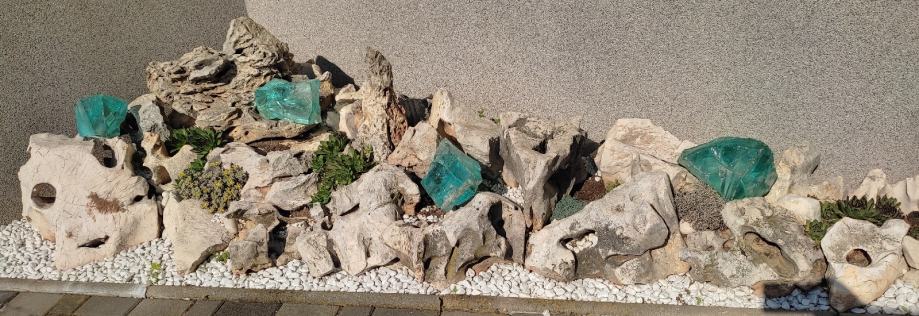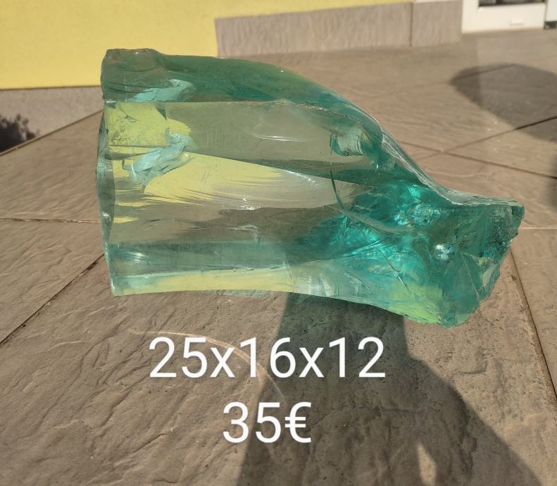 Staklo u oblicima kamena pogodno za kamenjare i ukrase oko kuće, vrta ili vikendica pogotovo, ako ima rasvjeta, vidljivo na slikama. Dimenzije i cijena vidljive na slikama. Ostalo još samo 5 komada sa slika.
