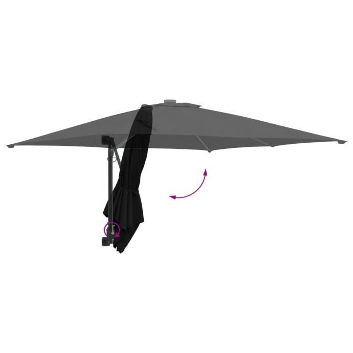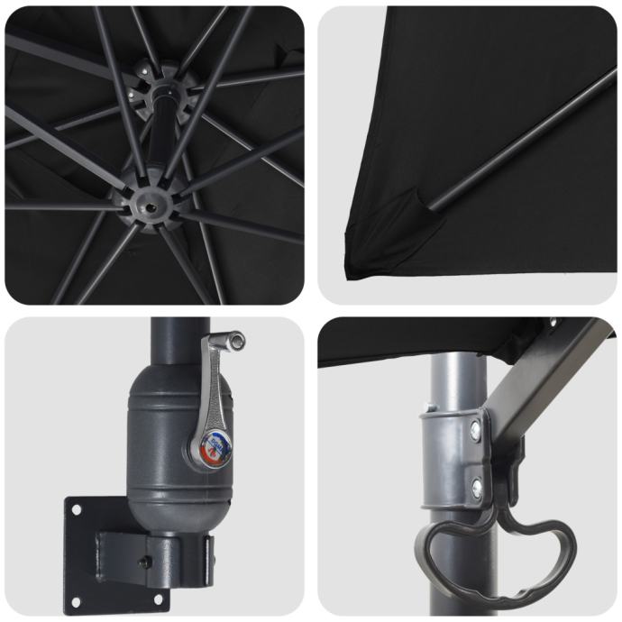 Ovaj veliki crni suncobran za dvorište odličan je za tvoje vanjske prostore. Moderan je i praktičan za balkon ili vrt. Sa dimenzijama od 300 cm u svakom smjeru, nudi puno sjene, čineći tvoje vrijeme vani ugodnijim na sunčanim danima.
