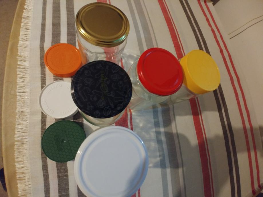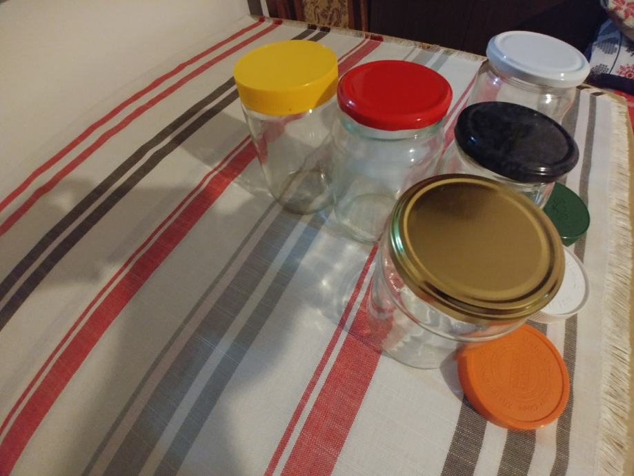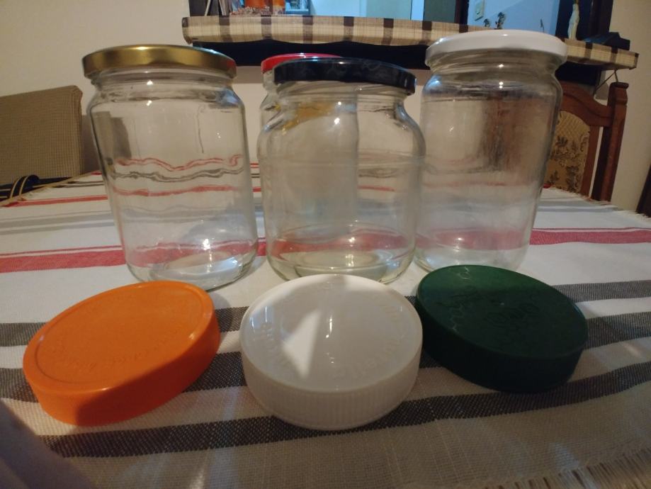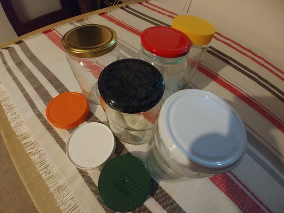 Čiste, oprane i bez etiketa tegle. Mogućnost spremanja zimnice, meda, voća ili za nešto drugo. Veličina od 3l, 2,4l, 720ml, 370ml ili manje. Cijena je 0,50 € za 720ml i 370ml a za 3l 2 € i za 2,4l 1,5 €. Za sve staklenke postoje poklopci raznih boja a za njih je cijena 0,15 €.