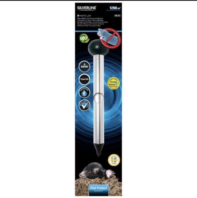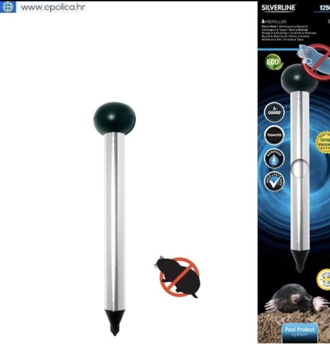 Bez posebne instalacije, kružnim zvučnim valovima rastjeruje krtice, zvučni valovi nisu štetni po zdravlje ljudi i ostalih životinja, ovisno od konfiguracije terena uređaj je efikasan do 1250 m² ovisno o vrsti tla, visina 38 cm, napajanje 4 x1.5 V D baterije ( nisu uključene u pakiranje )