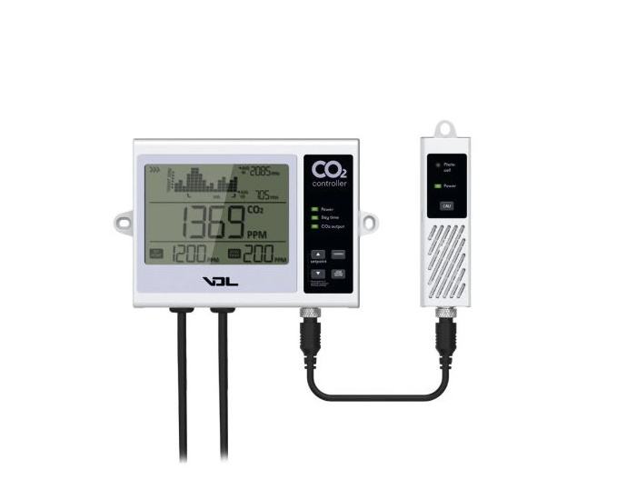 Digitalni kontroler CO₂ je kontroler jednostavan za korištenje za mjerenje i održavanje razine CO₂ u vašem stakleniku ili prostoriji za uzgoj: veliki digitalni LCD zaslon za očitavanje ppm vrijednosti u stvarnom vremenu, dan, sat, minuta, alarmi, itd. Ovaj zaslon je podijeljen u zone koje uvelike pojednostavljuju i ubrzavaju lokalizaciju parametara očitavanja. Sredina: možete označiti željene razine CO₂ u prostoriji. Zona: histereza ili mrtva zona Ima vanjsku sondu (ppm) s kabelom od 4,5 metara i fotoćeliju za aktiviranje regulatora tijekom dana jer nije potrebno noću. Ima osigurač koji štiti kontroler. Možete zamijeniti sonde kako bi regulator bio točan kao prvi dan.