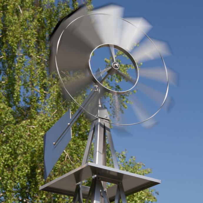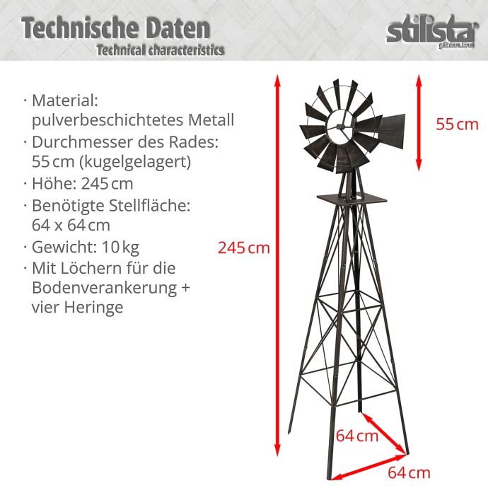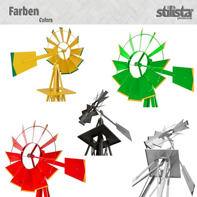 Naša STILISTA vjetroturbina sastoji se od čvrstog čeličnog okvira i zaštićena je od hrđanja bojom otpornom na vremenske uvjete. Texas kotač dostupan je u različitim bojama, što nudi različite mogućnosti uređenja krajolika. Sa svojih 245 cm visine, zvončić na vjetar pravi je vrhunac u vašem vrtu; za njegovo postavljanje potreban je prostor od 64 x 64 cm.
