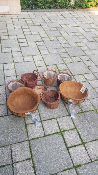 Velike viseće i male obične vrtne košare za ukras i dekoraciju cvijetnih tegli.