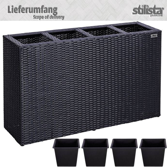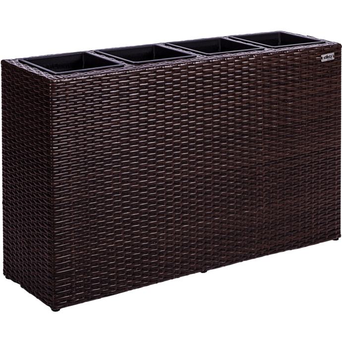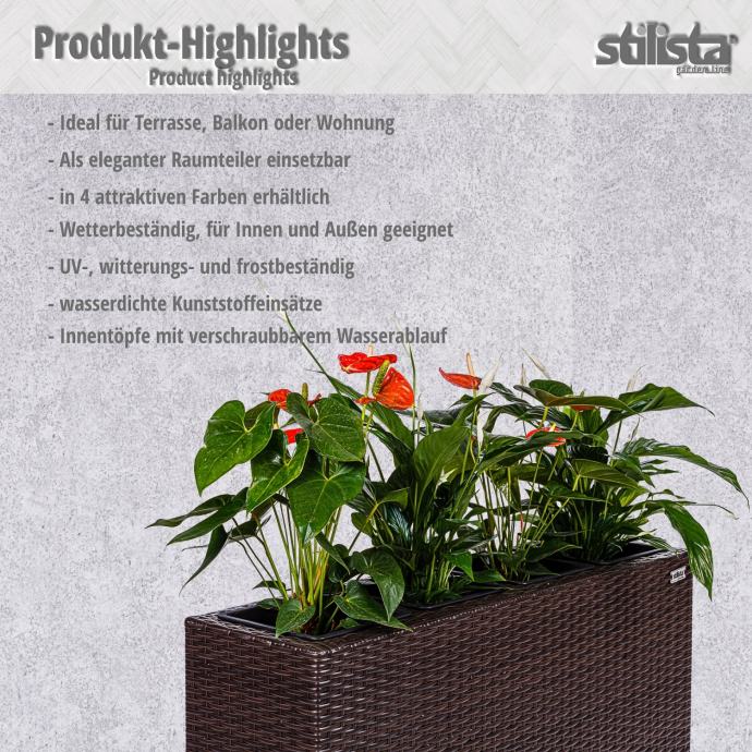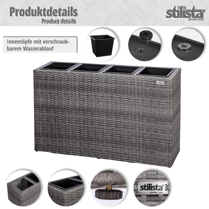 Naše prekrasne posude za cvijeće STILISTA sastoje se od okvira od ratana i četiri uklonjive posude. Izrađena od izdržljivog i vodoodbojnog poliratana, ova je žardinjera prednost za unutarnju i vanjsku upotrebu. Posude za biljke imaju plastične posude s odvodom za vodu koji se može ponovno zatvoriti, što sprječava da vaše biljke i cvijeće budu natopljeni vodom. Posuda za cvijeće dostupna je u crnoj, krem, smeđoj i sivoj boji.