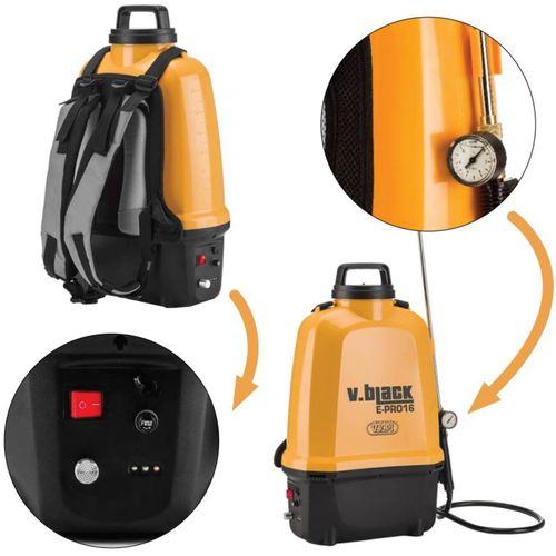 Baterijska prskalica VOLPI V-Black linija E-Pro 20VBE spremika 16 lit.s naprednim tehničkim i mehaničkim karakteristikama za plijevljenje i prskanje bilja. S kapacitetom spremnika od 16 litara i litijskom baterijom koja se može puniti, Volpi 20VBE E-Pro leđna prskalica jednostavna je za korištenje te vam omogućuje miran i precizan rad do 5 sati neprekidno. Opremljena podesivom mlaznicom od mesinga idealnom za radnje prskanja, i mlaznicom od mesinga i acetatne smole u obliku lepeze za aplikacije uklanjanja korova. Podstavljene naramenice i anatomski naslon za leđa osiguravaju maksimalnu udobnost pri radu. Proizvođač:VOLPI Model:20VBE Kapacitet spremnika 16 litara Spremnik od polipropilena 12 Vdc 2 Ah 96 Wh punjiva litijska baterija Priložena 2 raspršivača - Podesiva mjedena mlaznica za prskanje Elektronska regulacija pritiska Podesivi radni tlak 0,5 ÷ 5 bara 7,25 ÷ 72,5 psi Led kontrola napunjenosti baterije Teleskopsko koplje od nehrđajućeg čelika Podstavljene naramenice i leđa Manometar Punjač 12.6V 1.8A NBR brtve (visoke vlačne čvrstoće – otpornost na mineralna ulja i masti) Membranska pumpa visokih performansi Dužina dovodnog crijeva 1,5 m Promjer otvora za punjenje 105 mm Temperatura min.5° C / maks. 40°C Ukupne dimenzije 38,5 x 24 x 62 cm Težina prazne pumpe s baterijom 4,0 kg TRAJANJE BATERIJE Podesiva mjedena mlaznica za prskanje Tlak 5 bara - protok 0,74 l/min - Trajanje baterije 6 sati Tlak 4 bara - protok 0,95 l/min - Trajanje baterije 6,5 sati Tlak 3 bara - protok 1,2 l/min - Trajanje baterije 7 sati Tlak 2 bara - protok 0,6 l/min - Trajanje baterije 9 sati Mjedena mlaznica u obliku lepeze za plijevljenje Tlak 2 bara - protok 1,12 l/min - Trajanje baterije 7 sati Tlak 1 bar - protok 0,82 l/min - Trajanje baterije 9 sati Tlak 0,5 bara - protok 0,64 l/min - Trajanje baterije 15 sati