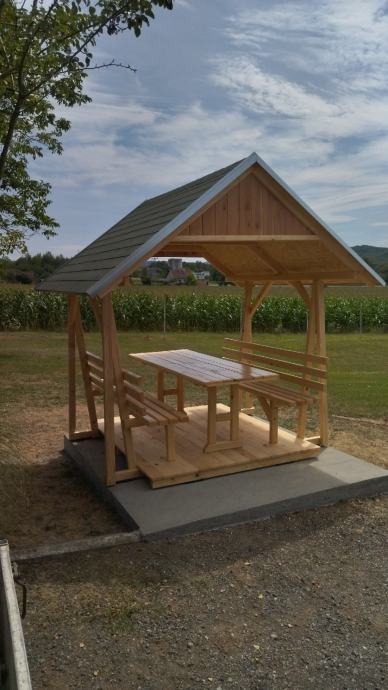 Sjenica je izrađena od punog drveta. Samostojeća je sa krovom i podom.