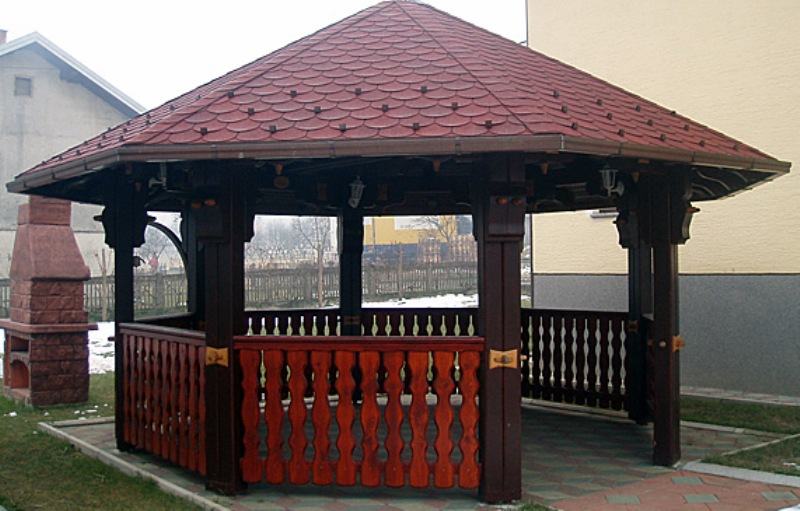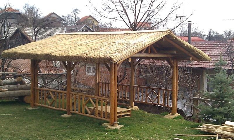 Vrtna sjenica, klupe, stol. Sjenica je izrađena od punog drveta arisa.