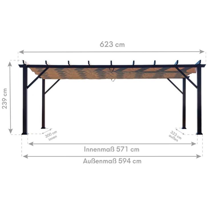Ugrađeno sunčano jedro od poliestera i najlona otpornog na UV zračenje pruža ugodan hlad na ljetnim temperaturama. Jedro se može koristiti fleksibilno i po potrebi se može otvoriti ili zatvoriti. Četiri noge su pričvršćene za pod vijcima. Oblikovani poklopci prekrivaju vijke i pružaju estetski završni izgled. Visokokvalitetni paviljon dizajniran je za cjelogodišnju upotrebu i bezbrižno ga možete ostaviti vani tijekom zime. Tijekom zimskih mjeseci preporučamo solarna jedra za unutarnje skladištenje.