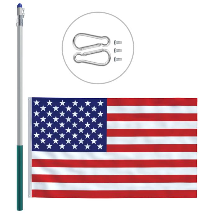 Zastava SAD-a napravljena je od izdržljivog poliestera i opremljena dvjema čvrstim mjedenim kopčama kako bi se osigurala dugotrajna upotreba. Uz to, zastava ima ojačane rubove i dvostruke šavove kako bi se spriječilo kidanje. Zahvaljujući jednostavnom sustavu spajanja, stup za zastavu može se začas postaviti, a visina se može mijenjati zahvaljujući njegovom teleskopskom dizajnu. Izdržljivi umetak za tlo omogućuje da se stup zabode u zemlju i ostane na mjestu. Uz uključeno uže i prstene, možete dizati i spuštati svoju zastavu bez problema.