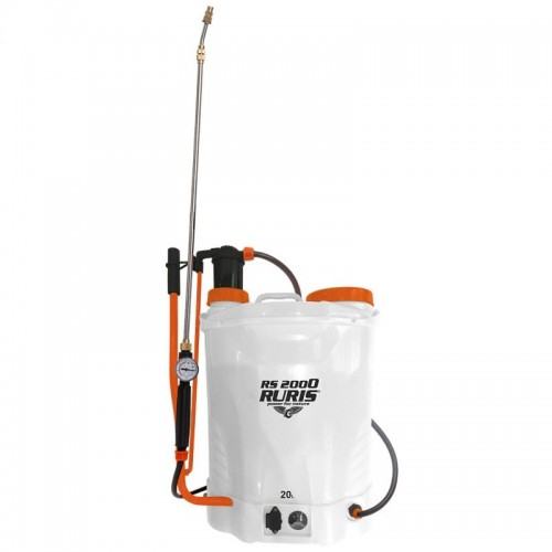 Akumulatorska leđna prskalica RURIS RS2000 pogodna je za široko područje primjene: suzbijanje nametnika, gnojidba, čišćenje, razni poslovni prskanja u vrtu. Metalni dijelovi su nehrđajući što osigurava dugi vijek trajanja: idealna za staklenike i zatvorene prostore jer nema ispušnih plinova, udoban dugotrajni rad zahvaljujući kvalitetnom presvučenom pojasu za nošenje, veliki otvor spremnika olakšava punjenje. Još jedna posebnost uređaja je veliki spremnik od 20 litara, koji omogućava duži rad bez potrebe za punjenjem spremnika. Za napajanje ugrađena je baterija 12V 8Ah što je dostatno za 4h rada.Uz bateriju ova prskalica ima mogućnost ručnog pumpanja kada se baterija isprazni.