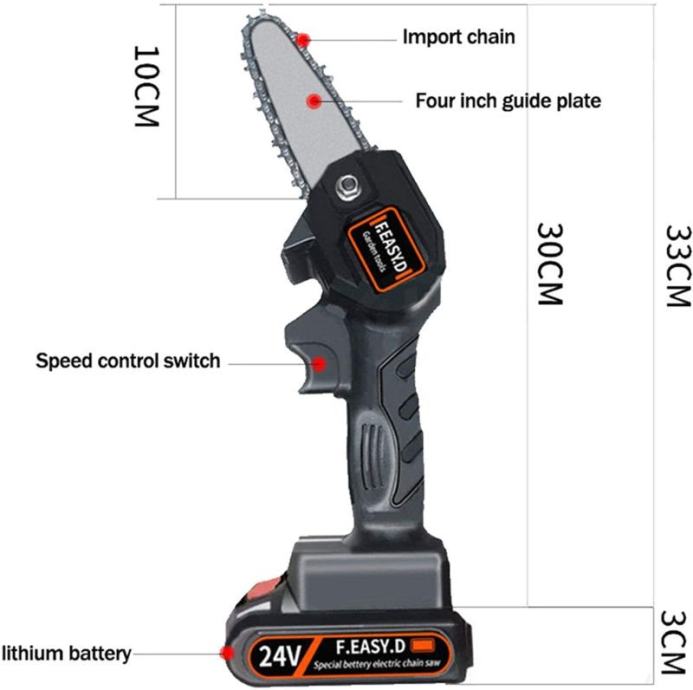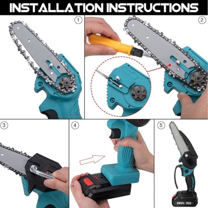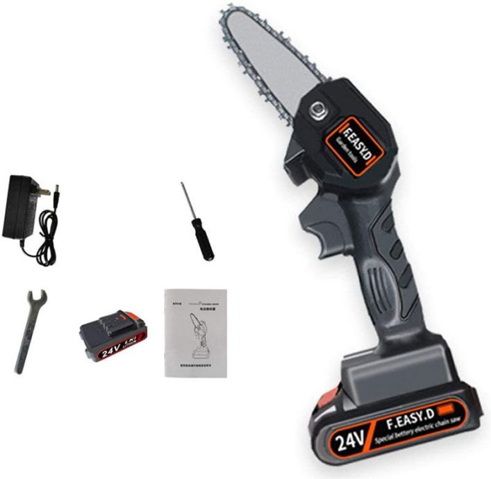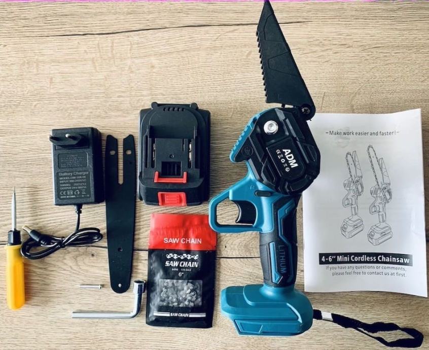 ➡️ Uz pakiranju dolazi električna pila, 2x baterija, punjač, ključ, odvijač, lanac, zaštita za oštri dio te korisnički priručnik.